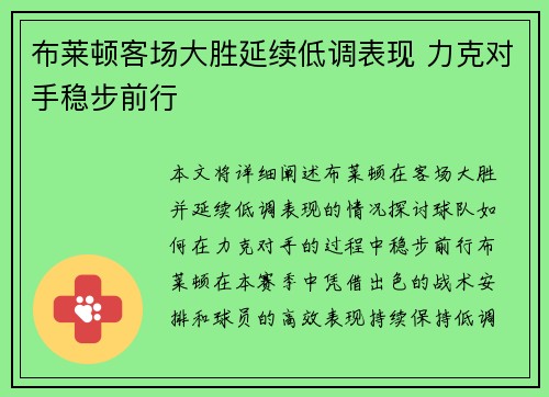 布莱顿客场大胜延续低调表现 力...