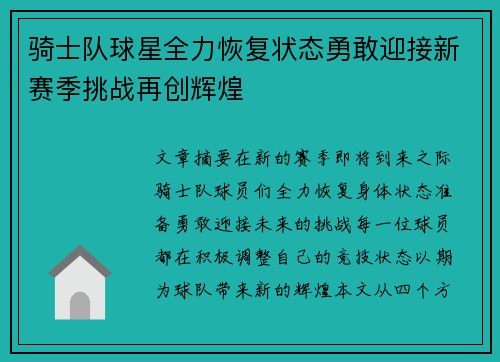 骑士队球星全力恢复状态勇敢迎接...